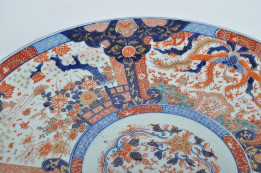 A Japanese Meiji period late 19th Century Imari charger plate of large form having central white enamel cartouche panel depicting a gilded floral medallion spray. The borders decorated with good quality ocher cobalt and gilt details. Concentric blue circles. to base with spur marks and three blue floral sprays. Measures 56cm wide.