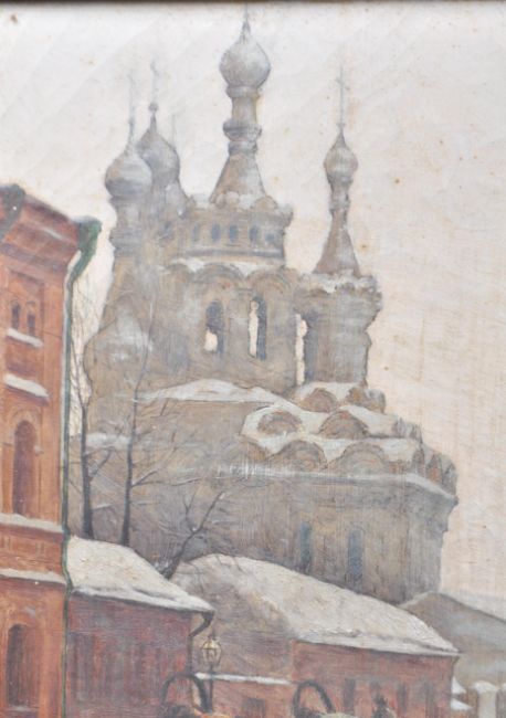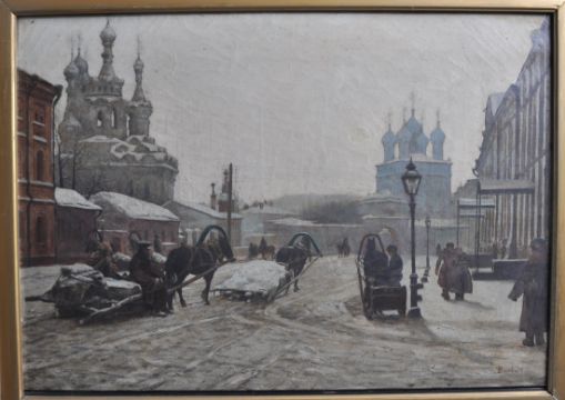 Paul Louis Bouchard ( French 1853 - 1937 ) A street scene view towards the Kremlin, Moscow, Russia 1895. Oil on canvas painting being signed to the corner and dated. Set within stunning believed original florentine carved cushion gilt wood frame. The painting having been retained within the private vendors family since the 1920's. Frame measures 86cms x 69cms ) Canvas 56cms x 39cms ( measured from the rear )