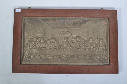 A 19th century Victorian Coalbrookdale cast gilt bronze rectangular plaque being cast in relief with a depiction of ' The Last Supper ' inscribed to reverse ' Coalbrookdale ' Set into a good oak frame.  Measures 78cms x 48cms