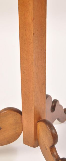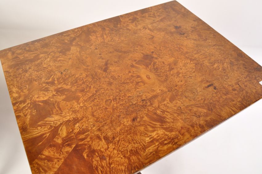 A 19th century Swedish Biedermeier burr maple wood pedestal wine table. Raised on tripod splayed legs with octagonal column support supporting a stunning rectangular fixed burr maple wood table top above. Measures 75cms high x 53cms wide x 40cms depth