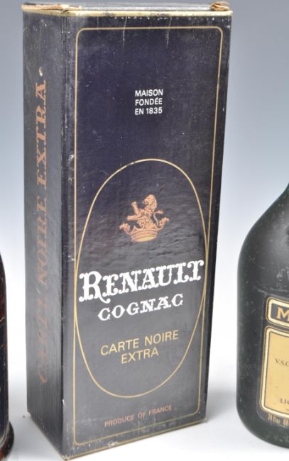 A bottle of Renault Cognac Carte Noire Extra, a bottle of Renault Carte L'Argent cognac together with a Hennessy Fine Champagne Cognac and a Martell Medaillio Liqueur cognac