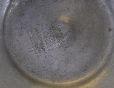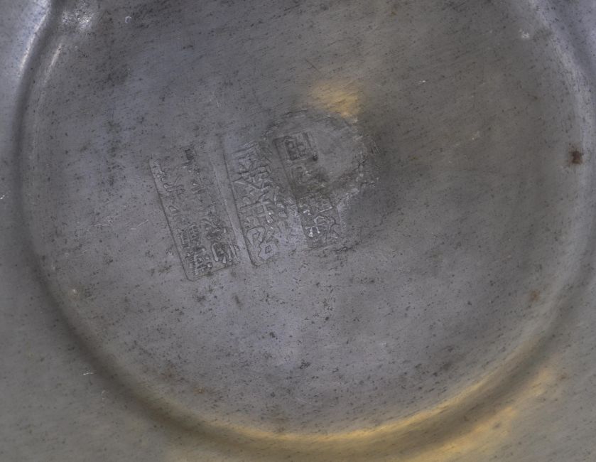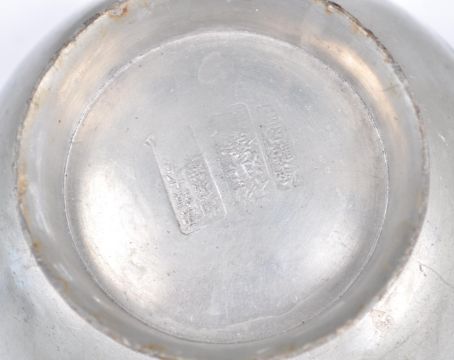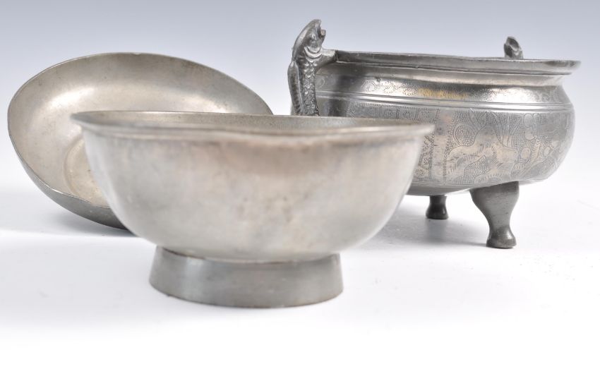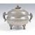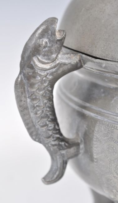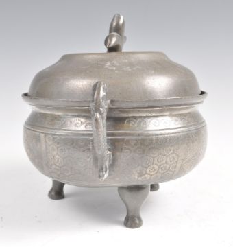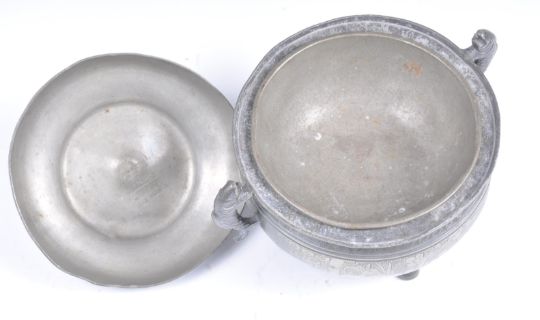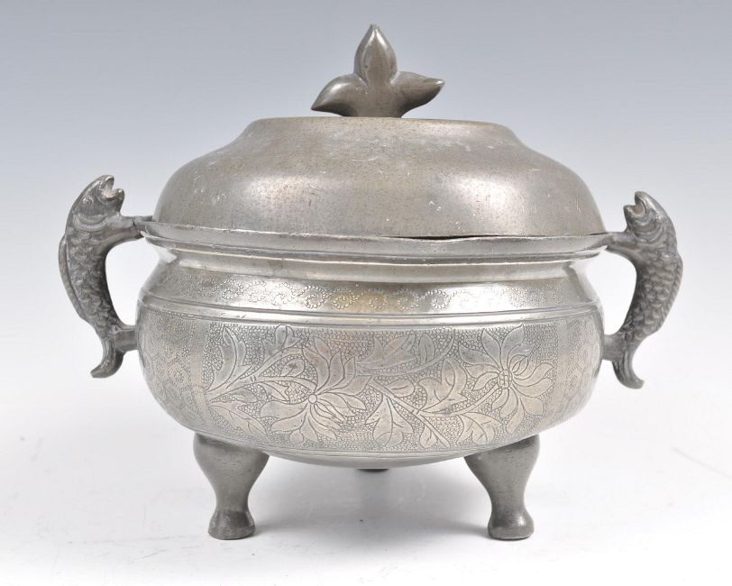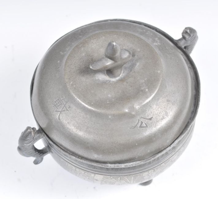 An early 20th Century Chinese Republic period pewter tureen food vessel raised on tripod legs with twin carp handles with pike top finial lid. Character marks and calligraphy to body. Lid opens to reveal removable bowl to interior. The bowl and tureen both having extensive character marks to bases. Measures 15cm high.