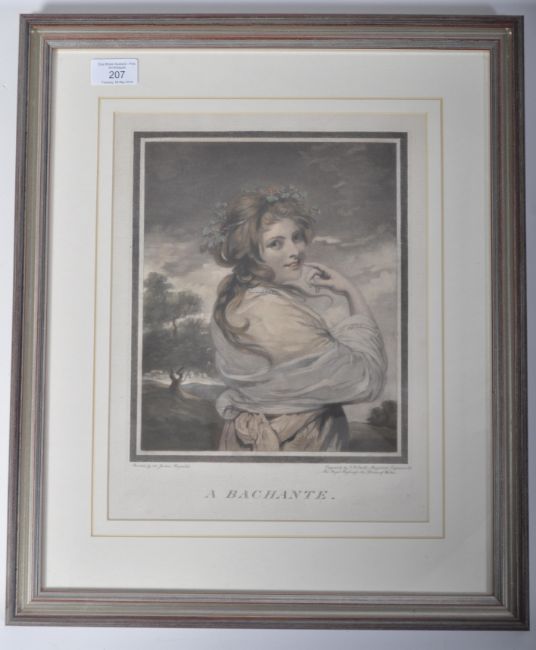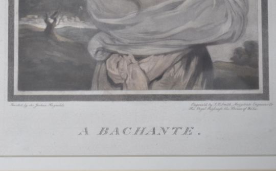 After Sir Joshua Reynolds ' A Bacchante ' being engraved by J.R. Smith. 18th century.  Mezzotint engraver to his Royal Highness the Prince of Wales. Framed and glazed.  Measures 25 cm x 32.5 cm. Frames measure 48.5 cm x 40.5 cm.