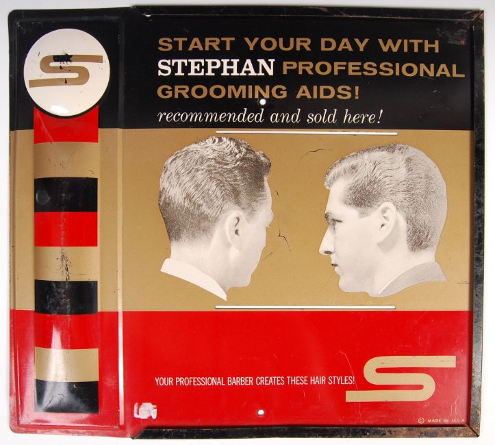 Duckworth - Stephan - Two original 20th century retro vintage advertising signs. The Duckworth sign being in French and printed to card depicting medicine jars with essence and colours to front. The Stephan barbers sign being enamelled tin and depicting a man at two angles, showing the hairstyle. Measures 43 cm x 47 cm.