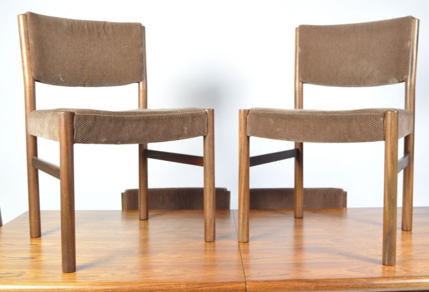 A large mid century Danish extending dining table of rectangular form being raised on turned legs with rectangular table top having single extension leaf. Together with a set of matching 6 dining chairs with original velour upholstery. Measures 73 cm high x 184 cm long (the leaf measures 53 cm) x 91 cm deep.