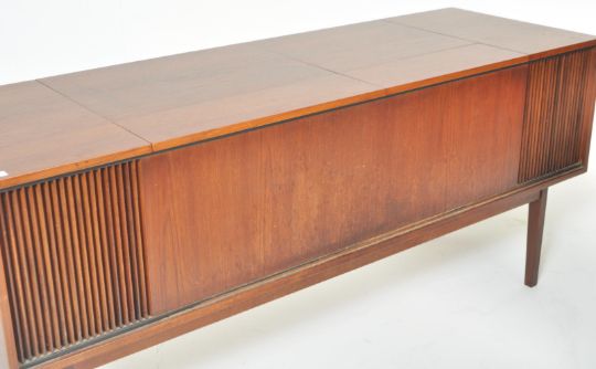 A stunning mid century teak wood Danish Bang & Olufsen Beomaster 900 teak cased stereogram. Raised on squared legs with grilled facia to the low, wide and deep body. The twin sectional hinged top with inset radiogram and record deck.