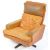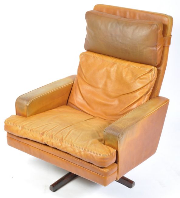 Fredrik A. Kayser - Vatne Mobler - Mod 807 - A 1960's retro vintage swivel easy / lounge chair / armchair having a tall back and headrest squared and angular armrests with cushioned seat, backrest and headrest, all upholstered in a desert tan leather. all raised on a wooden four point star base. Measures 97cm x 78cm x 80cm.