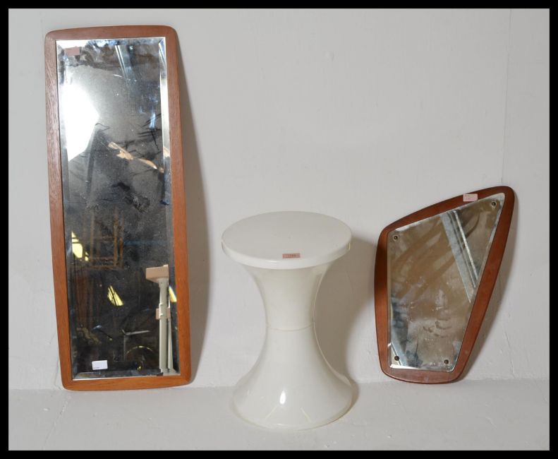 A retro 20th Century Tam Tam stool in white together with two retro framless teak wood atomic wall mirrors.