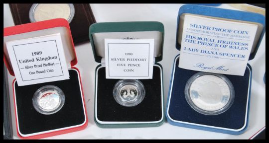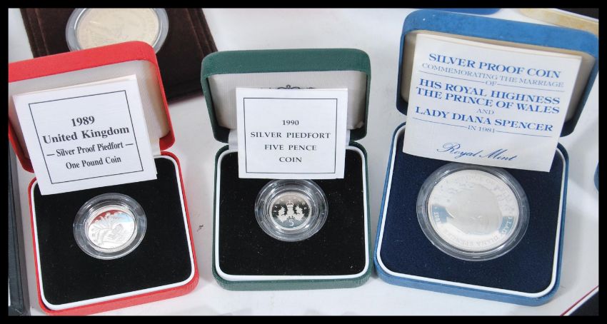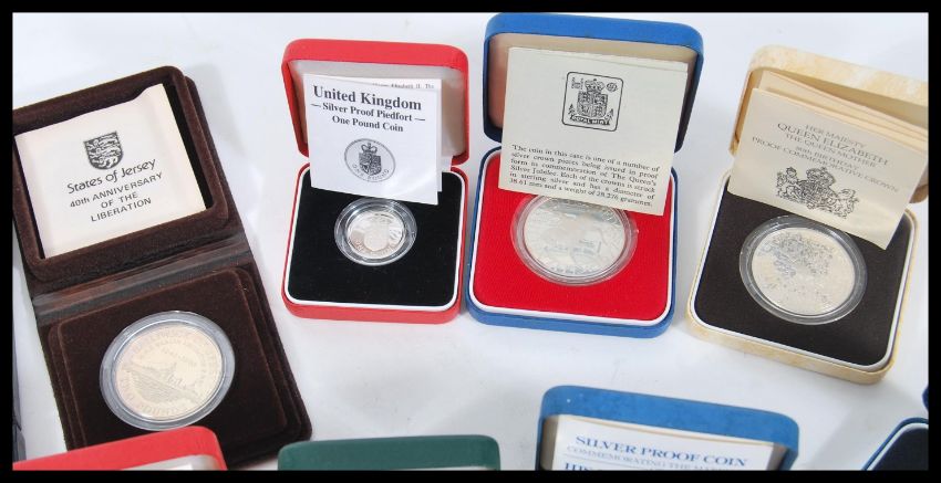 A selection of silver proof commemorative coins to include Queen Mother 90th Birthday Silver Proof Crown, 1981 Prince of Wales and Lady Diana coin, the Queen Mother proof commemorative crown, 1990 Silver Piedfort five pence coin, 1977 jubilee crown, 1983, 1988 and 1989 silver proof piedfort one pound coins, 1984-1987 one pound silver proof piedfort collection, States of jersey 40th anniversary of the liberation nickel coin.