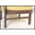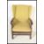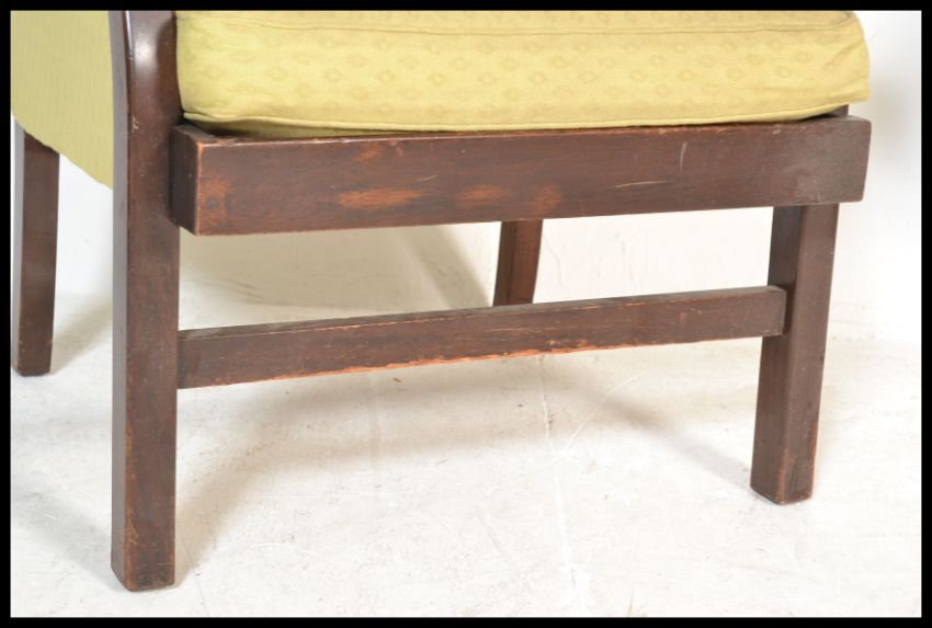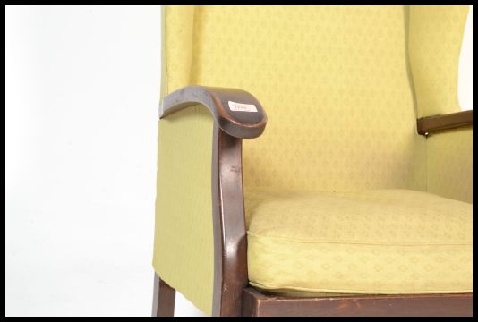 A retro 20th Century Parker Knoll style wing back arm chair having a dark wood show frame raised on square supports, upholstered in a yellow fabric. Measures 103 cm high x 64 cm wide x 58 cm deep.