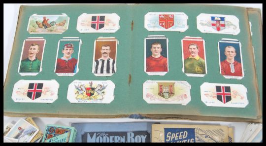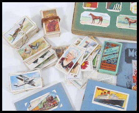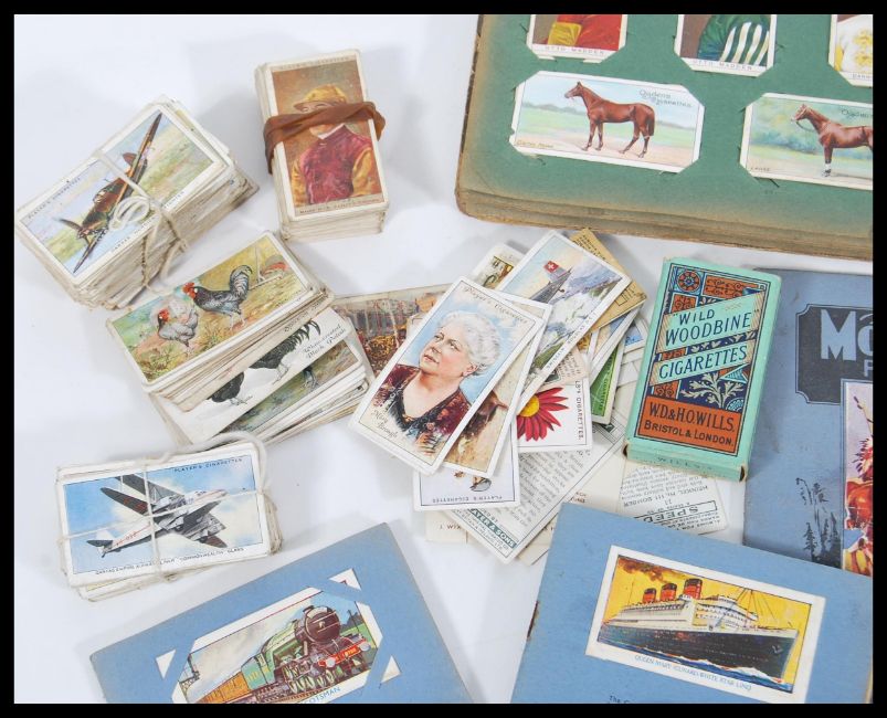 A selection of vintage cigarette cards to include two small albums and a selection of mixed cigarette cards including Ogden's; cigarettes Jockey's and Owners Colours, British Birds, Football club Colours, Flags and Funnels of Leading Steamship Lines, Racehorses, Player's; Dogs, Footballer's, Boy Scout & Girl Guide, and a selection of other cards including Wills's.