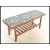 A vintage retro 20th Century teak wood tile top coffee table having a sectional vibrant blue retro print flower tile top on shaped supports with railed magazine rack underneath. Measures 40 cm high x 99 cm wide x 37 cm deep.