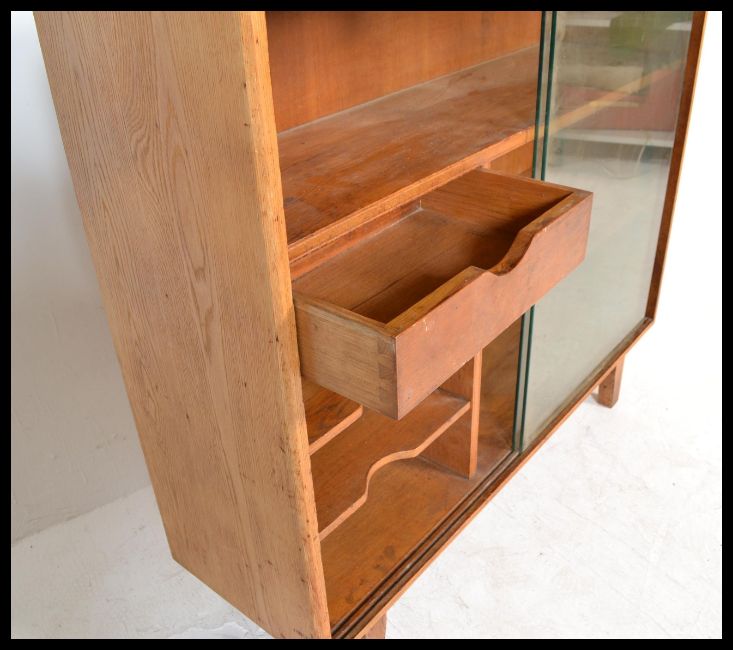 An early 20th century golden oak and glass display cabinet having sliding glass doors and an arrangement of adjustable shelves and draws. Measures 102 cm high x 106 cm wide x 30 cm deep.