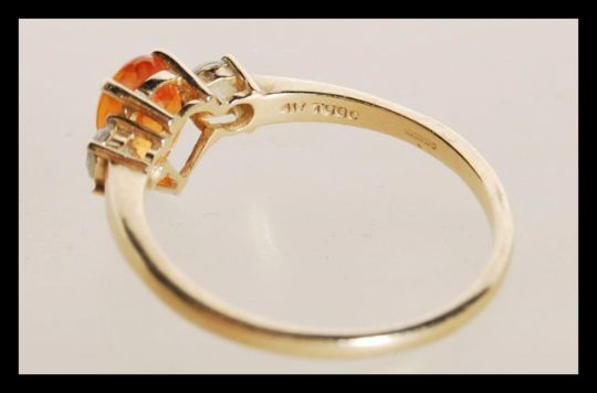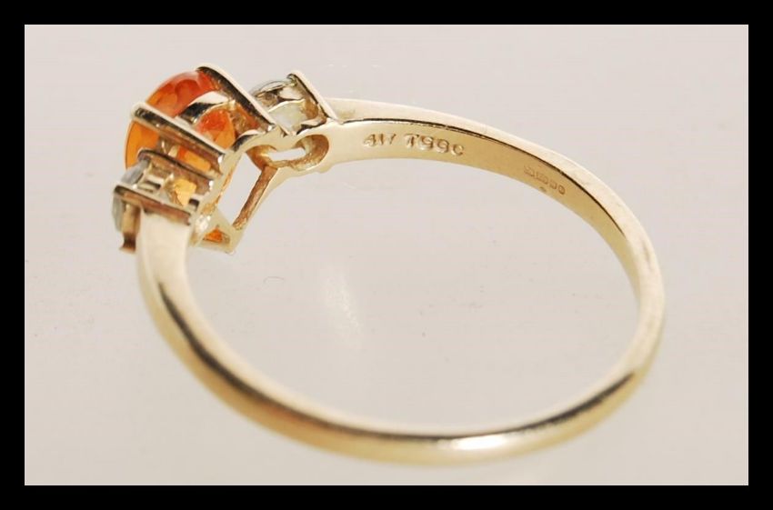 A hallmarked 9ct gold ladies dress ring set with a tear drop cut orange stone flanked by two white accent stones. Hallmarked Birmingham 2013. Weight 1.7g. Size O.