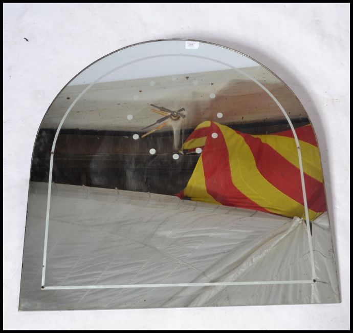 A 1930's Art Deco mirror clock. The mirror of arched form with original inset clock to the centre, acid etched borders elsewhere. 76x75cm