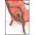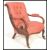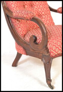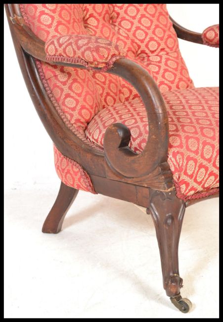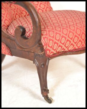 A 19th Century Victorian walnut slipper elbow chair / armchair upholstered in a red and gold fabric, open scroll arms raised on shaped cabriole supports terminating on castors. Measures 90 cm high x 69 cm wide x 60 cm deep.