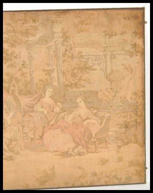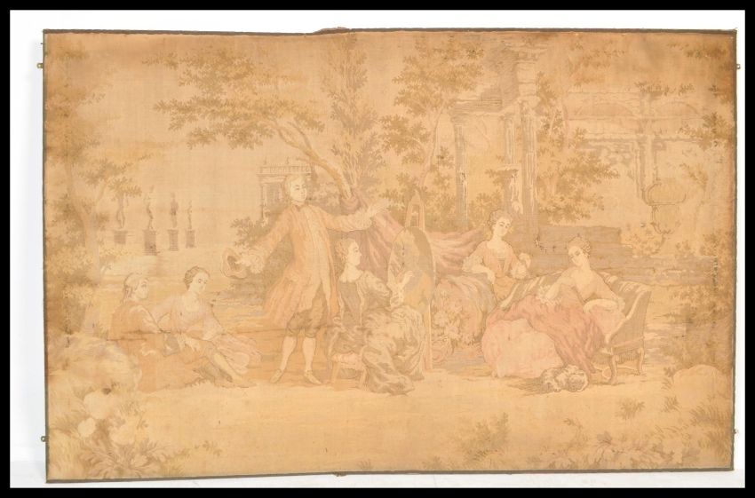 A large 19th Century tapestry embroidery depicting a gentleman with artist painting two maidens and foliate scenes to distance. Set to a wooden frame that folds.