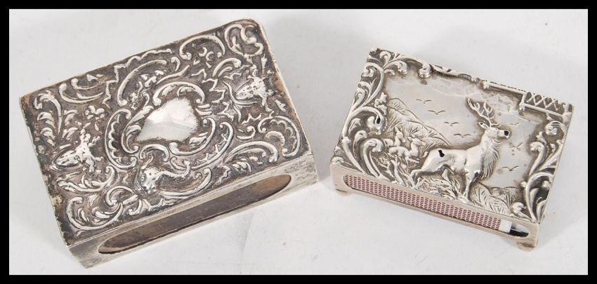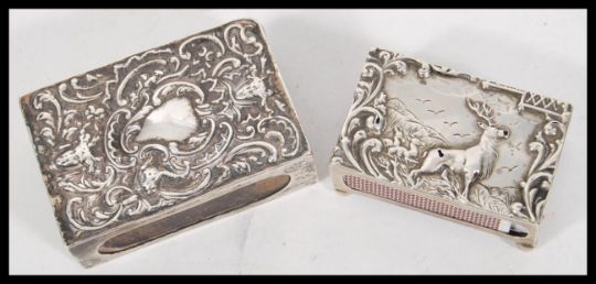 Two early 20th Century Edwardian hallmarked silver matchbox covers or boxes to include an example by S&Co with stag and deer decoration and rococo scroll border hallmarked for Birmingham 1902. The other hallmarked for london 1901 makers  William Comyns & Sons with Rococo influence design and face masks. Measures 8 cm wide x 5 cm deep.