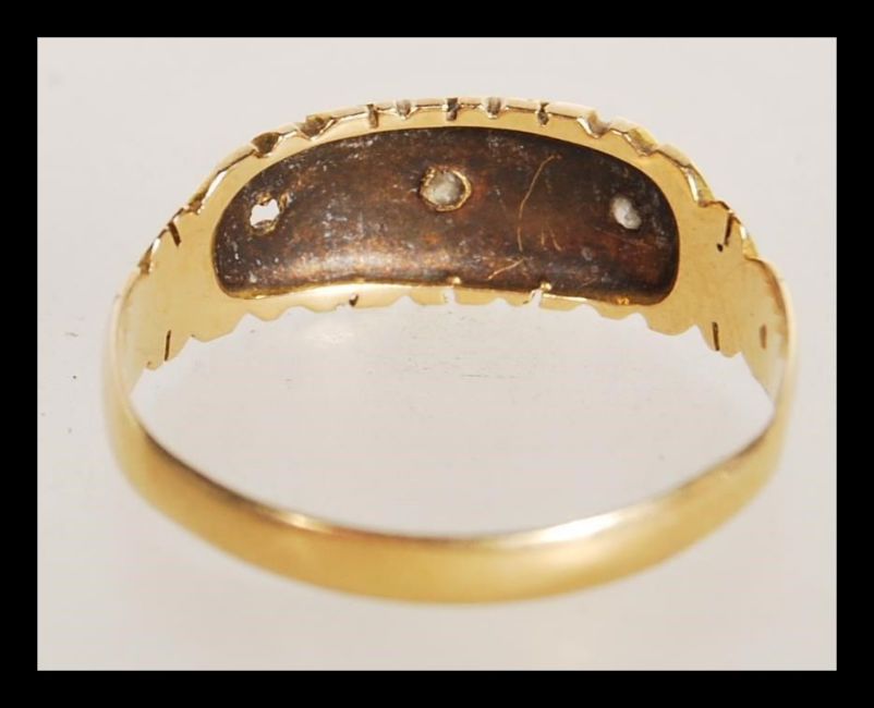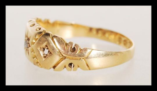 A 19th Century Victorian 18ct gold ring set with a central diamond in a gypsy setting having engraved geometric decoration. Hallmarked Chester 1897. Weight 2.0g. Size N.