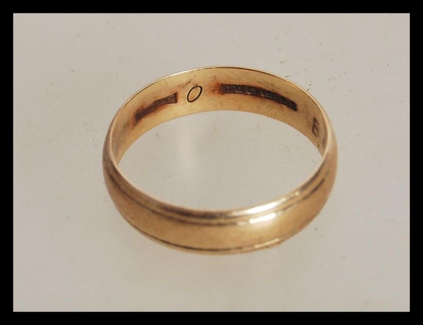 A 9ct gold hallmarked wedding ring band, having marks for Sheffield 1962. Weight: 2.3g size O.5.