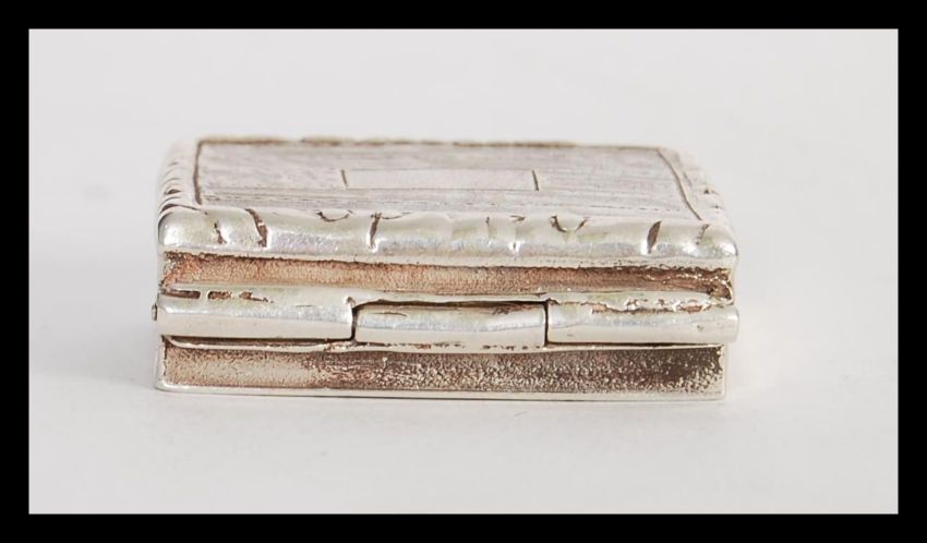 An unmarked silver tests as silver vinaigrette of rectangular form having hinged lid revealing pierced scrolled interior. Weighs 24.3 grams. Measures 1 cm high x 3 cm wide.