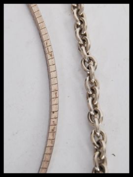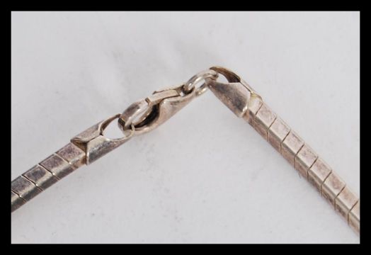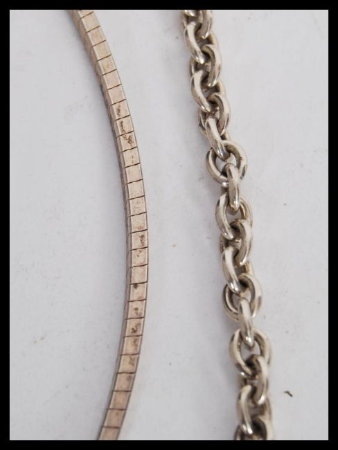 A silver hallmarked ladies chain necklace with a decorative toggle clasp with heart pendant (chain measures 15 inches) along with a stamped 925 silver snake chain with a lobster clasp (measures 16 inches). Gross weight 61.3g.