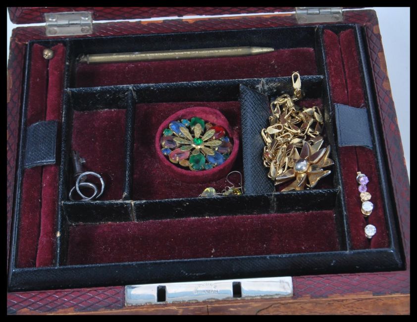 A good collection of vintage jewellery to include a Miracle rhinestone brooch, necklaces, perfume bottle, faux amber necklace, crucifix pendant, watch. gold tone bangle, ring, all within a vintage jewellery box with a Bramah lock.