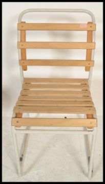 A pair of vintage retro 20th Century stacking chairs having slatted wood seats and backs raised on tubular metal supports. Measures 85 cm high x 40 cm wide x 55 cm deep.