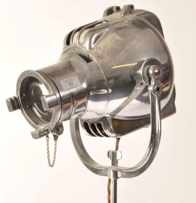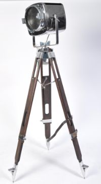 Strand Electric - Model 743 - a 20th century retro vintage industrial searchlight / theatre spot lamp light. Restored to a high standard, being highly polished and PAT tested. Raised on a stained pine tripod adjustable base. Strand markings to rear of lamp. Fully working order.