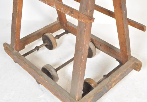 An antique vintage industrial oak framed wooden mill trolley removed from a leather factory in Hampshire. Originally used to move drying leathers around the factory.The trolley being of simple wooden construction with wooden beam atop forming a triangular structure metal trolley wheels with a slatted wooden top.