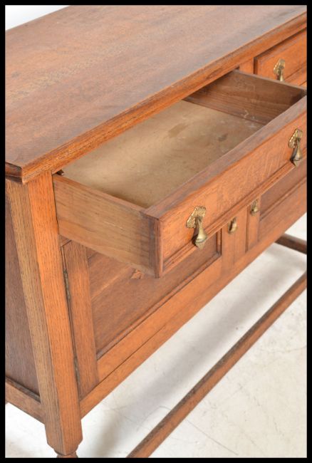 A 1920's oak barley twist sideboard having two short drawers over cupboards beneath, all raised on barley twist legs. Measures 92 cm high x 120 cm wide x 45 cm deep.