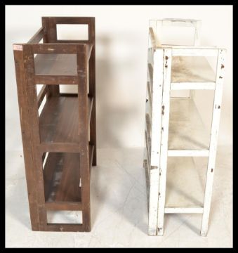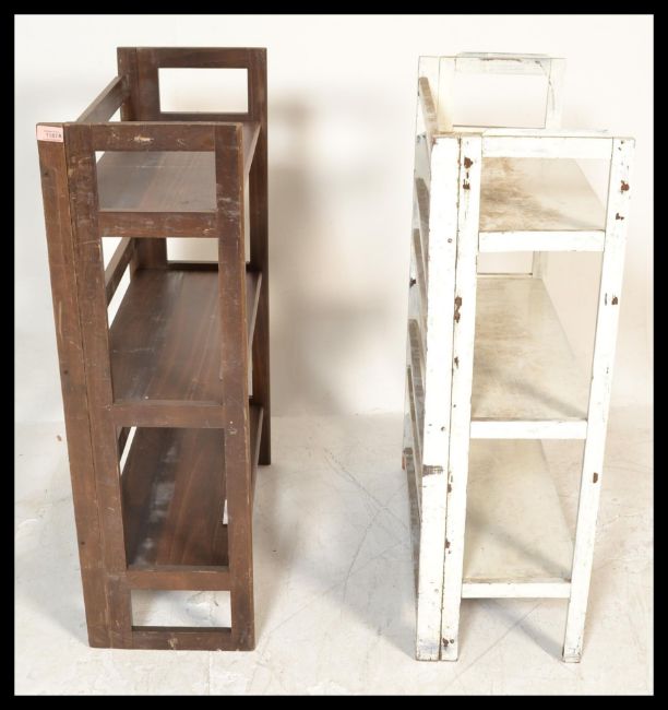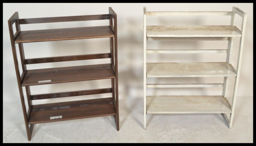 A pair of retro / vintage 20th Century folding / stacking bookcases, each with three fitted shelves. Measures 94 cm high x 70 cm wide x 30 cm deep.
