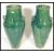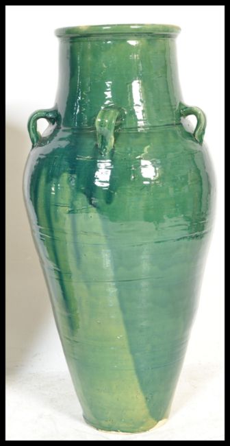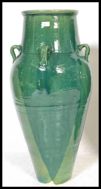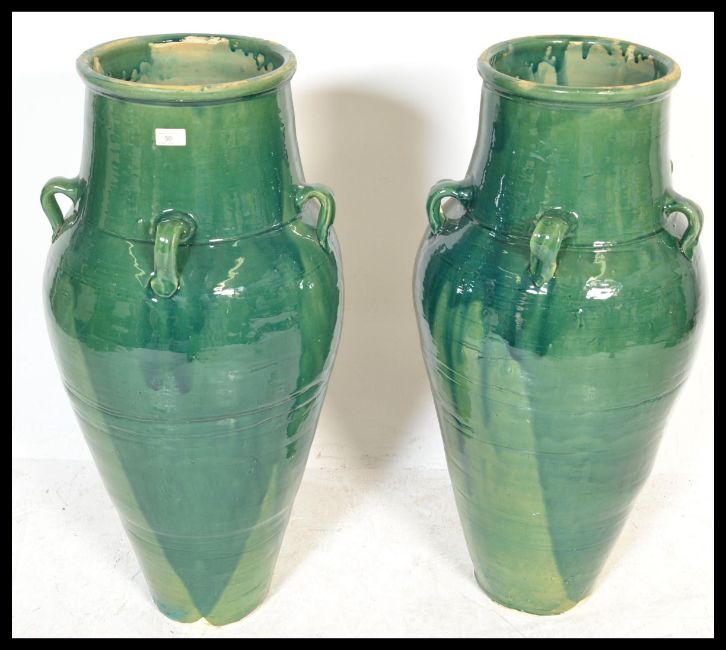 A large and impressive pair of Persian Sharab green glazed wine vessels of amfora form having four handles to the top and a flared circular rim. Measures 90cm high x 37cm diameter.