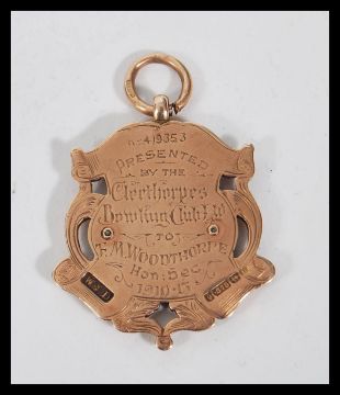 An early 20th Century Edwardian hallmarked 9ct gold fob medal of armorial form. Enamel cartouche to the front depicting Lawn Bowls. Inscription to the verso reading ' Presented By The Cleethorpes Bowling Club Ltd to T.M. Woodthorpe Hon Sec 1910-1913'. Birmingham assay mark, date letter for 1912 and makers mark for William James Dingley. Weight 14.4g.