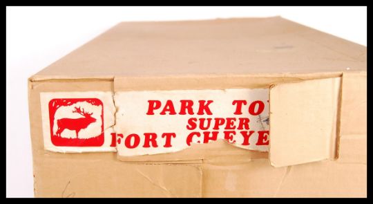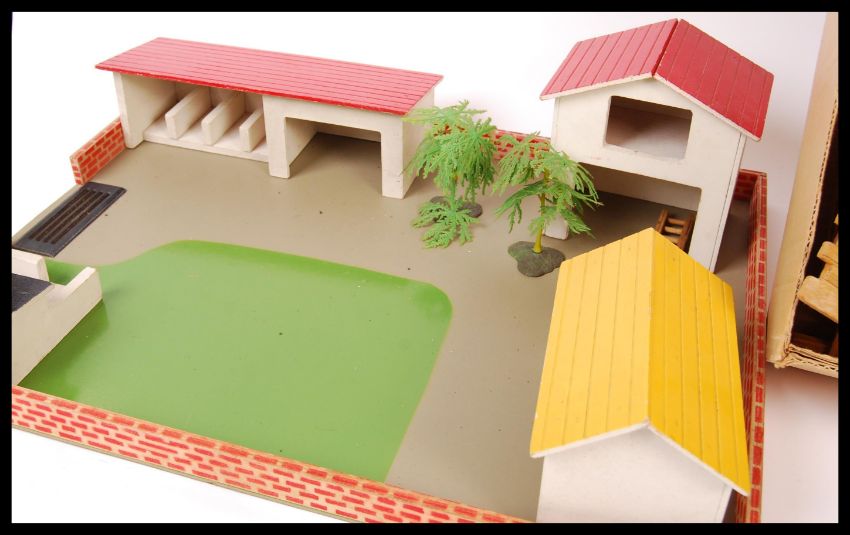 Two vintage hardboard model toy playsets for plastic / lead model figures to include; Britains Fort Cheyenne and Joytoy Farm yard. Measures; 61cm x 46c,
