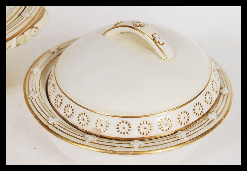 An early 19th Century Wedgwood ceramic bathroom set in an ivory blush palette consisting of wash bowl and ewer jug with two soap or shaving dishes. Impressed Wedgwood stamps to bases. Jug measures 29cm high by 20cm wide.