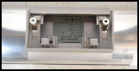 A pair of 20th Century Bang and Olufsen BeoLab 6000 upright slim speakers on stands together with surround bar and amps, finished in polished steel.