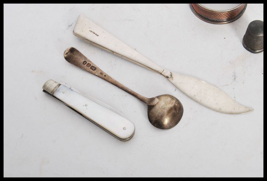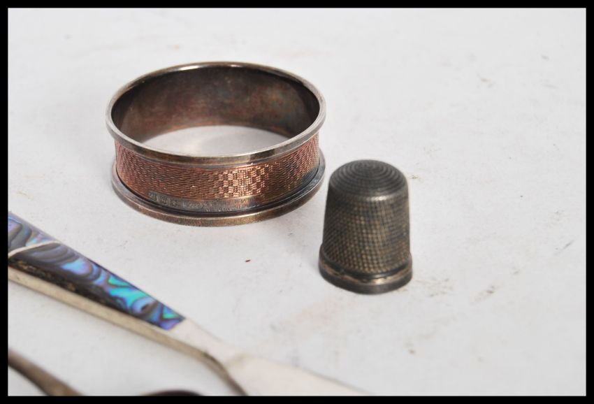 A collection of silver items to include a hallmarked napkin ring, hallmarked thimble, sterling silver knife with abalone handle and a fruit knife with mother of pearl handle and stainless steel blade.