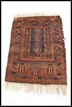 A 19th Century Persian ISlamic floor carpet rug having a deep pile wool red ground with hand woven geometric medallions and borders with tassel ends. Measures 150 cm x 90 cm.