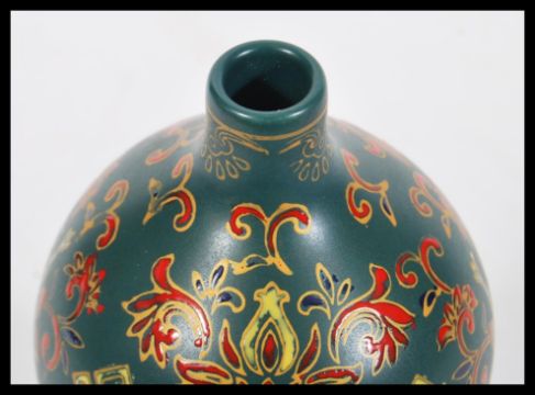 A 20th Century Chinese porcelain double gourd vase having a deep teal ground with hand enamelled red blue and gilt floral sprays and scrolls. Six Guangxu character marks to base. Measures 23cm high.