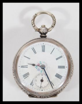 A continental silver 800 pocket fob watch having a white enamel face with Roman numeral chapter ring and faceted hands. Subsidiary seconds dial to three with enamel pictorial to verso. Face measures 35 mm diameter.