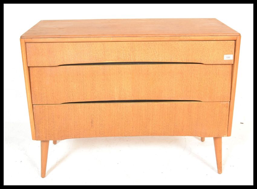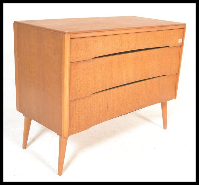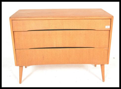 A vintage retro mid 20th Century teak wood Beehive fronted chest of drawers having a bank of three graduating drawers, raised on tapering legs. Measures 71 cm high x 91 cm wide x 42 cm deep.