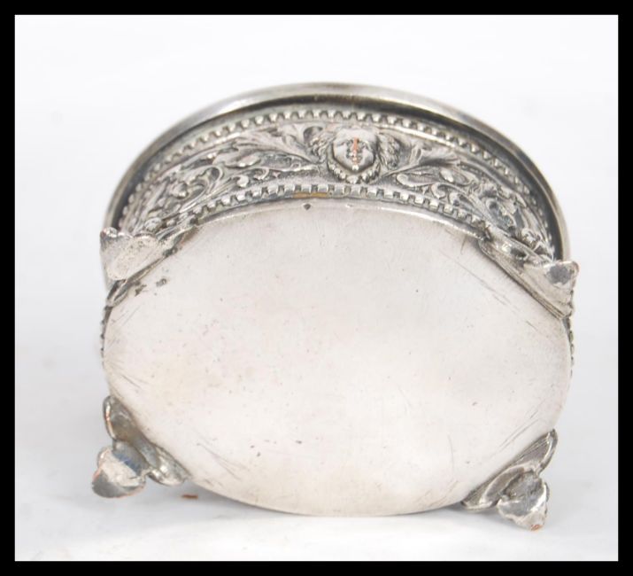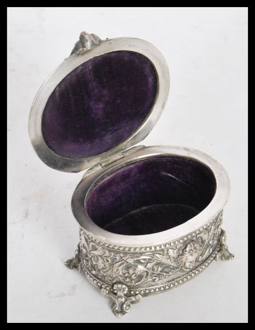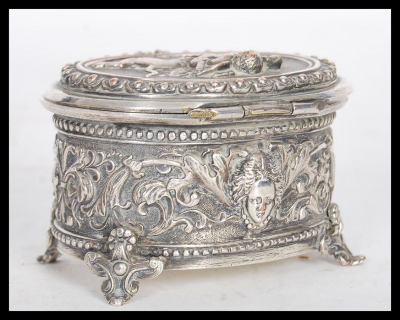 An early 20th Century jewellery casket / box in the Rococo taste, the hinged lid depicting cupid on horseback in relief, the sides with floral swags and masks raised on scrolled supports, crushed velvet interior.