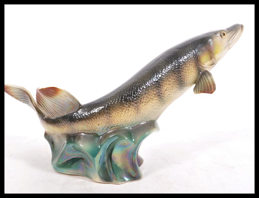 A vintage retro large 20th Century ceramic lustreware model of a pike (No 344) figure by Jema (Holland),  impressed maker's marks and model number to base.