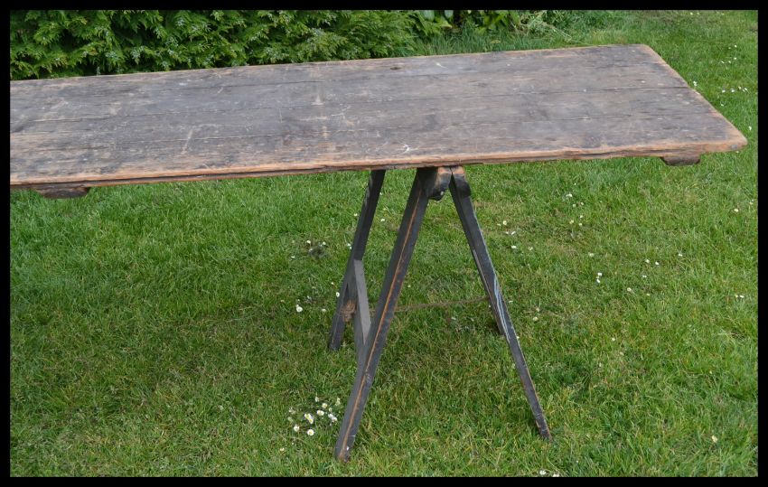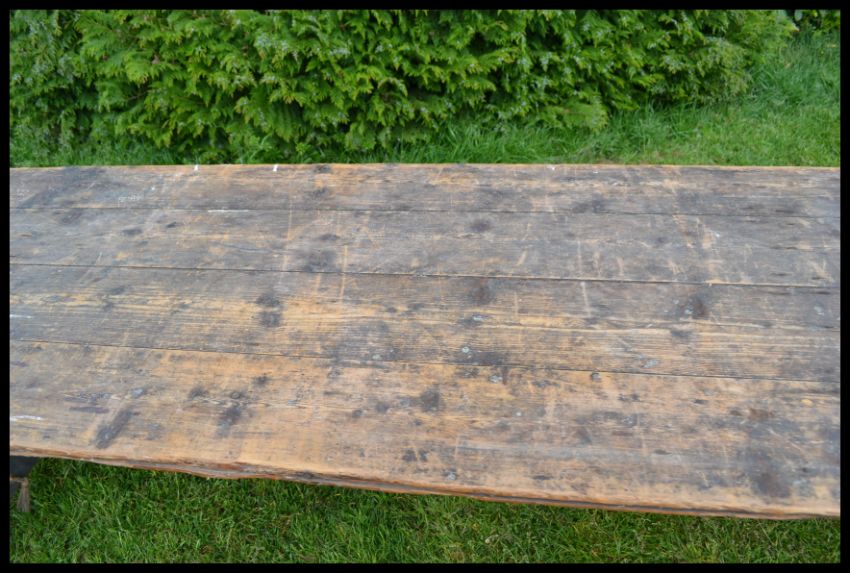 A large vintage 20th century wooden industrial fair / fete trestle ( dining ) table. Of very large, long form with planked wooden top being raised on folding leg base