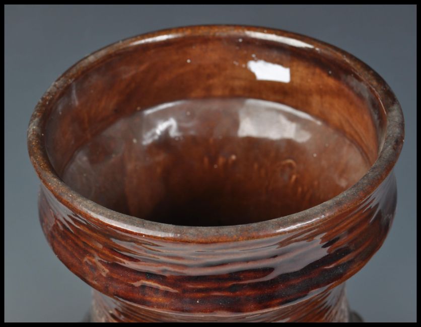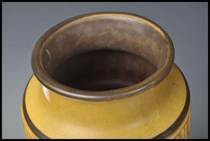 A group of three vintage retro 20th Century West German fat lava style pottery floor standing vases / stick stands. Includes a floral decorated example, example onion decoration and another. Measures 46cm high.