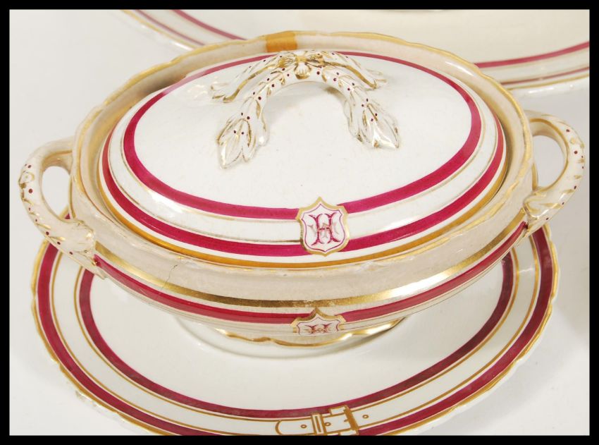 A rare 19th Century Victorian hand painted ironstone dinner service having gilt and red belt buckle border with matching armorial monograms. Impressed makers stamp and date lozenge to verso. Consists of dinner plates, lidded tureens, trays etc. Tallest measures 17cm height x 36cm width
