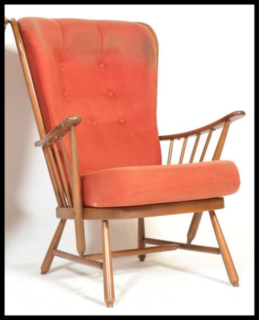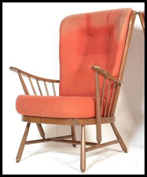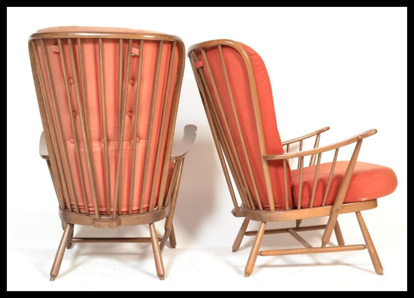 A pair of Ercol beech spindle back fireside armchair,  with upholstered cushions, raised on turned legs united by an H framed stretchers.