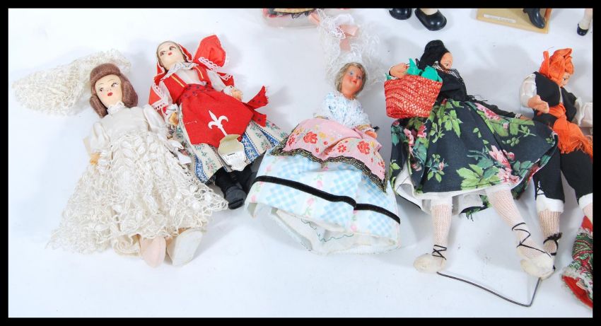 A collection of vintage mid 20th Century world dolls dressed in traditional costumes to include an Arabian doll riding a leather camel, a Swiss doll, a Florentine doll, a Maltese bride, Scottish Highland doll etc.