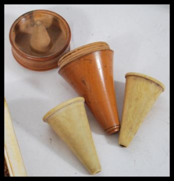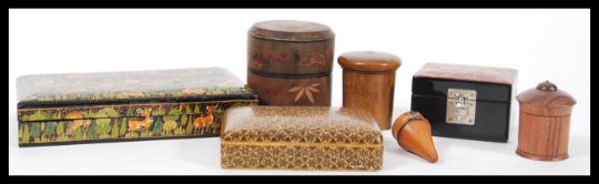 A collection of vintage and antique treen and wooden wares to include a Vizagapatam box with gilded decoration, paper mache boxes, Japanese lacquer box, set of miniature bovine funnels in treen case, olivewood etc.